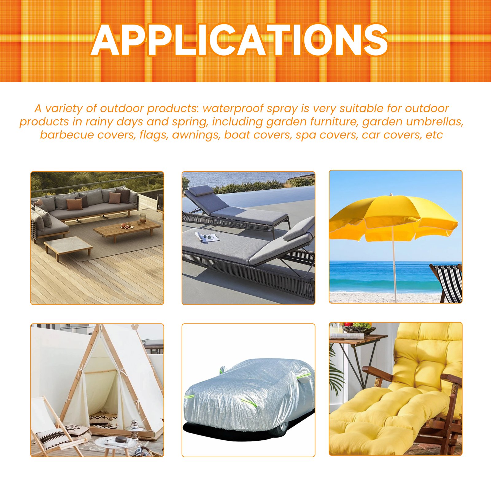 Our outdoor waterproof fabric spray contains silicone mixtures, resins and surfactants. It can help prevent fabric fading by blocking harmful rays. Provides excellent water resistance. Suitable for outdoor fabric, dry and tasteless, resist yellowing. Its use method is very simple: first clean the surface of the outdoor fabric, and then spray the outdoor waterproof protective fabric evenly on the surface of the item. After use, it can provide excellent water resistance, maintain furniture, efficient waterproof and sunscreen, long-lasting use effect, easy to use, so that your furniture has been new.